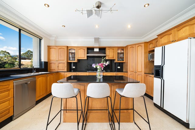 - The central kitchen features a timeless timber aesthetic with stone benchtops, high end appliances, gas cooktop, double pantry and breakfast island with ample cabinetry
